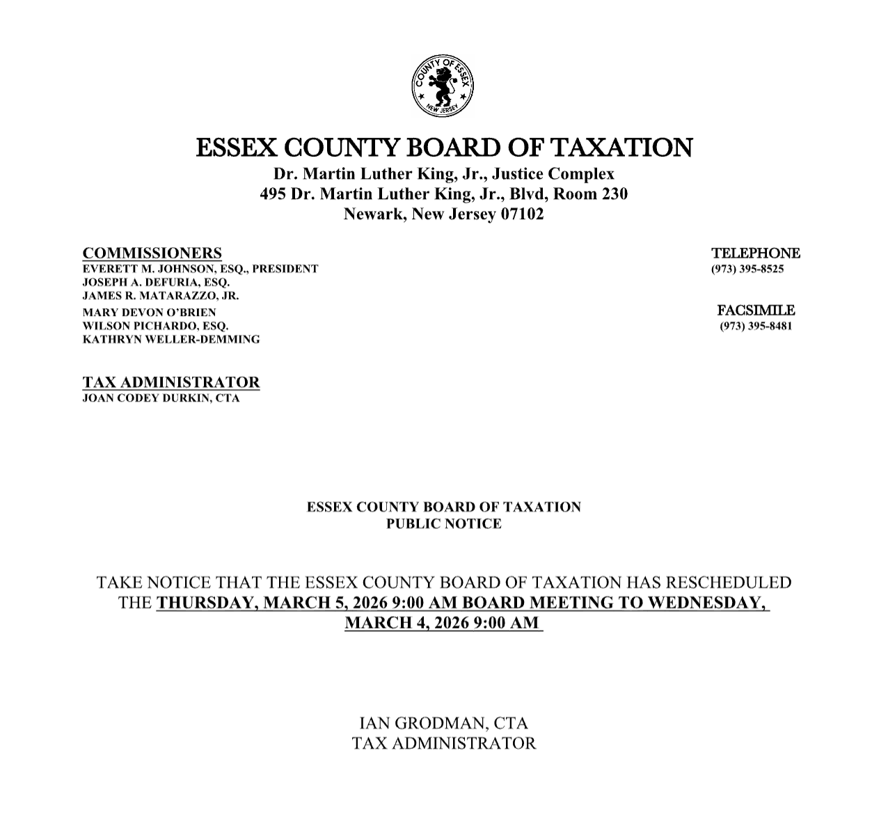 THE ESSEX COUNTY BOARD OF TAXATION HAS MOVED! THE NEW ADDRESS IS: